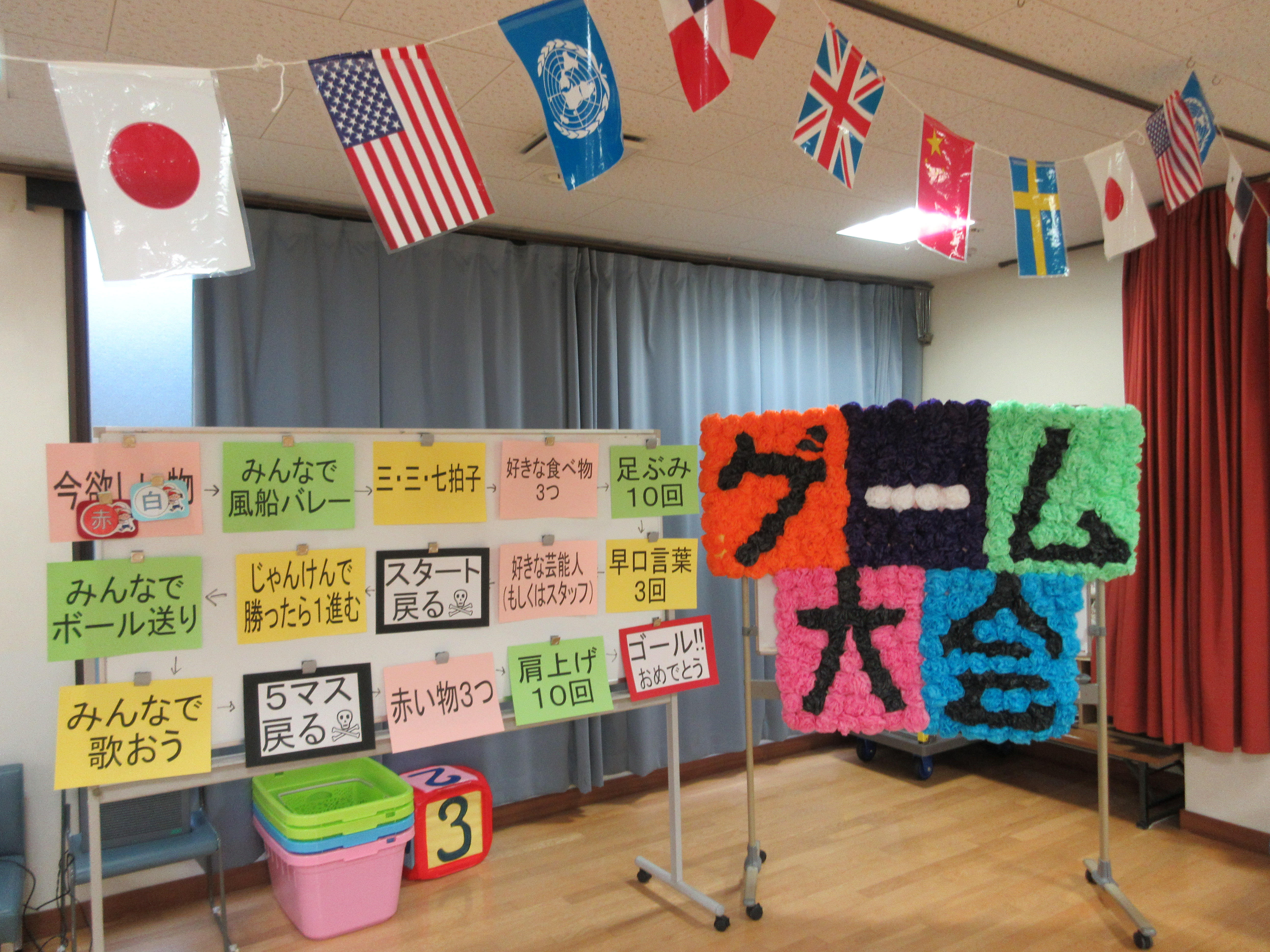 感染対策のもと、風船バレーや玉入れ、すごろくゲーム等を行い、患者さん同士で協力することの大切さを感じながら身体全体を動かしていました。スタッフや患者さんの温かい応援もよく見られました。